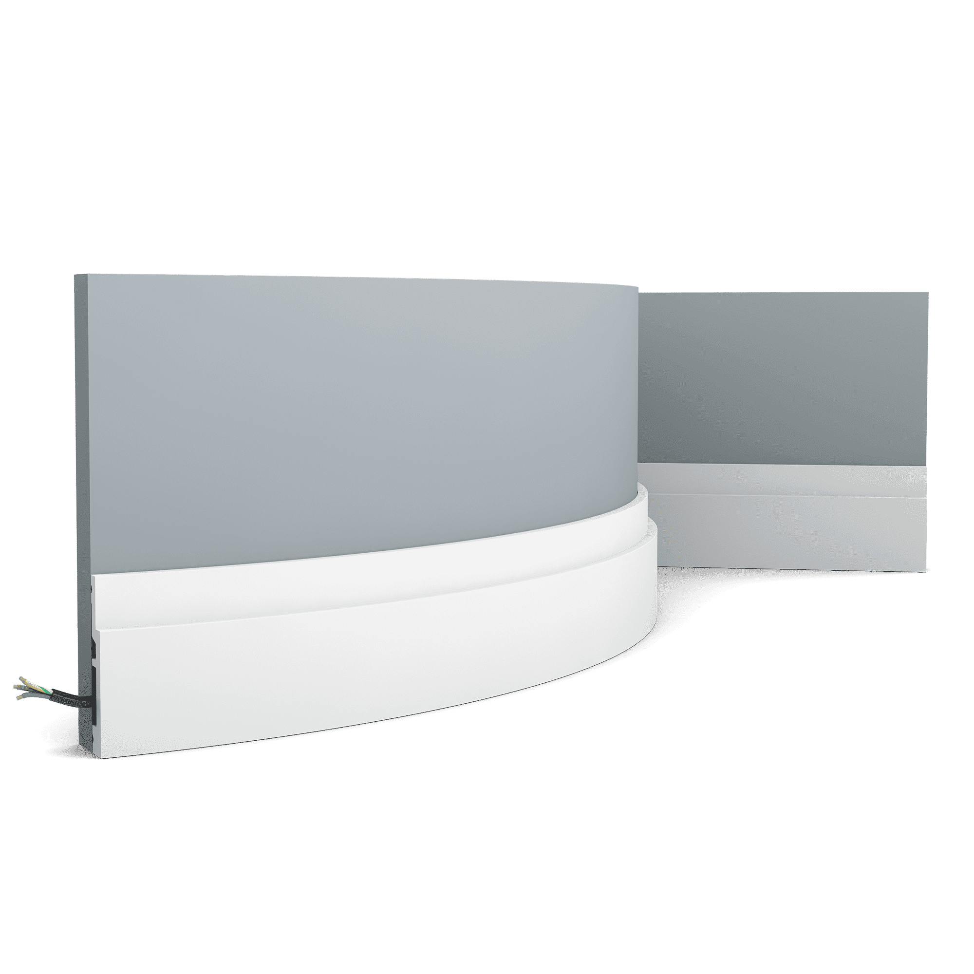 Orac Decor SX187F, Flexible version of the SX187. The pure shape and perfect proportions of this smallest High Line skirting board create an ideal transition between floor and wall. Thanks to its Flex technology, curved walls and surfaces are no problem. Installation remark: It is necessary to screw this profile on the wall. Flex Radius: R min = 40 cm